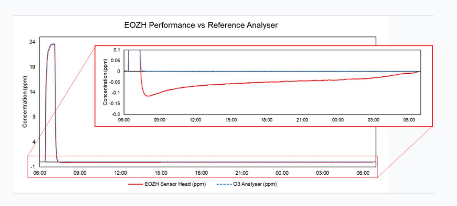 暴露于高濃度的 O 3會暫時影響電化學傳感器的基線,導致其讀數比示例濃度低(或負)高達 0.1-0.2ppm。