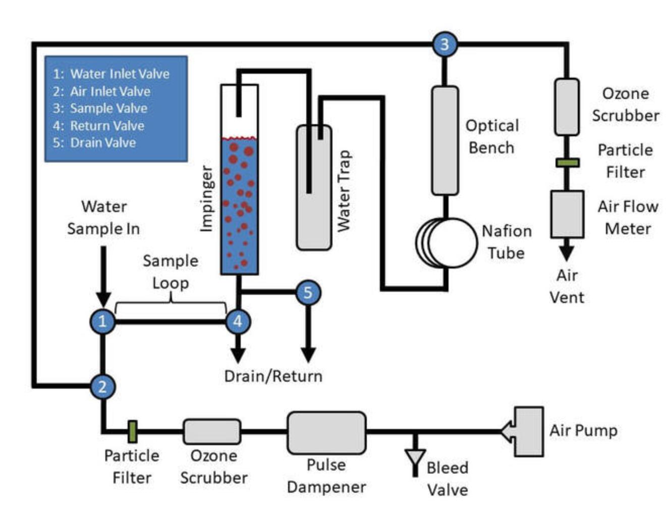 下面的示意圖顯示了儀器操作所需的附加組件。其中包括用于調節空氣流速的放氣閥、用于減少氣流波動的脈沖阻尼器、用于從環境空氣中去除臭氧的臭氧洗滌器用于噴射樣品并從排出的空氣中洗滌臭氧、空氣顆粒過濾器、用于保護空氣的集水器光學平臺暴露于液態水,Nafion 管平衡環境空氣的濕度,以及空氣流量計。